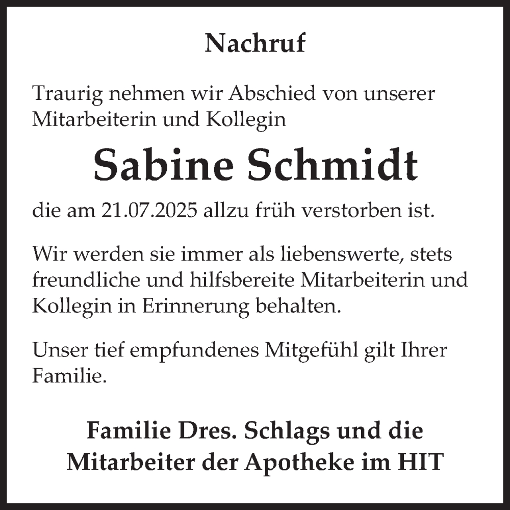 Hier finden Sie alle Traueranzeigen aus der Zeitung, die bisher für Sabine Schmidt erschienen sind. Weitere Traueranzeigen, die in der Zeitung erscheinen, werden hier ebenfalls aufgelistet