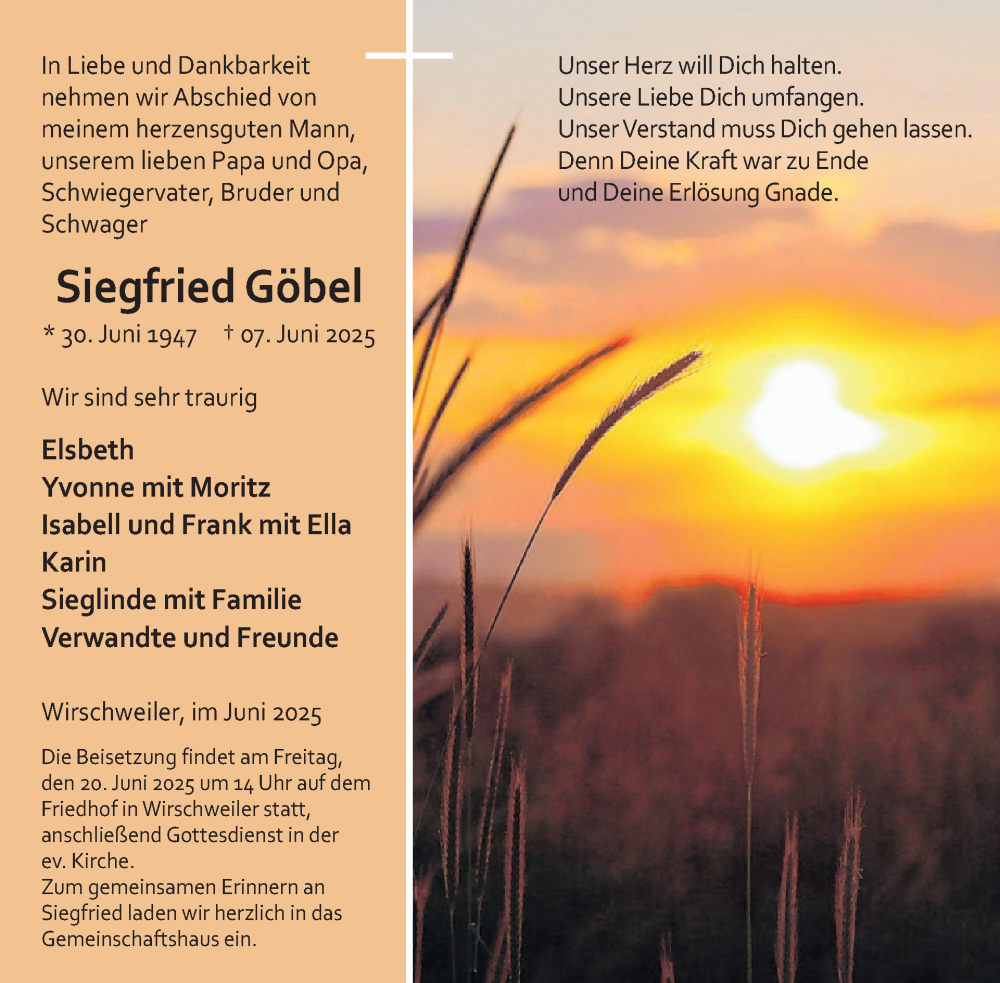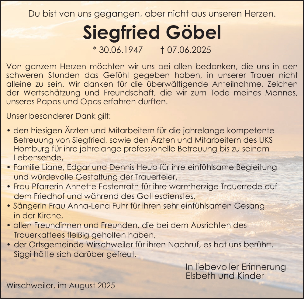 Hier finden Sie alle Traueranzeigen aus der Zeitung, die bisher für Siegfried Göbel erschienen sind. Weitere Traueranzeigen, die in der Zeitung erscheinen, werden hier ebenfalls aufgelistet