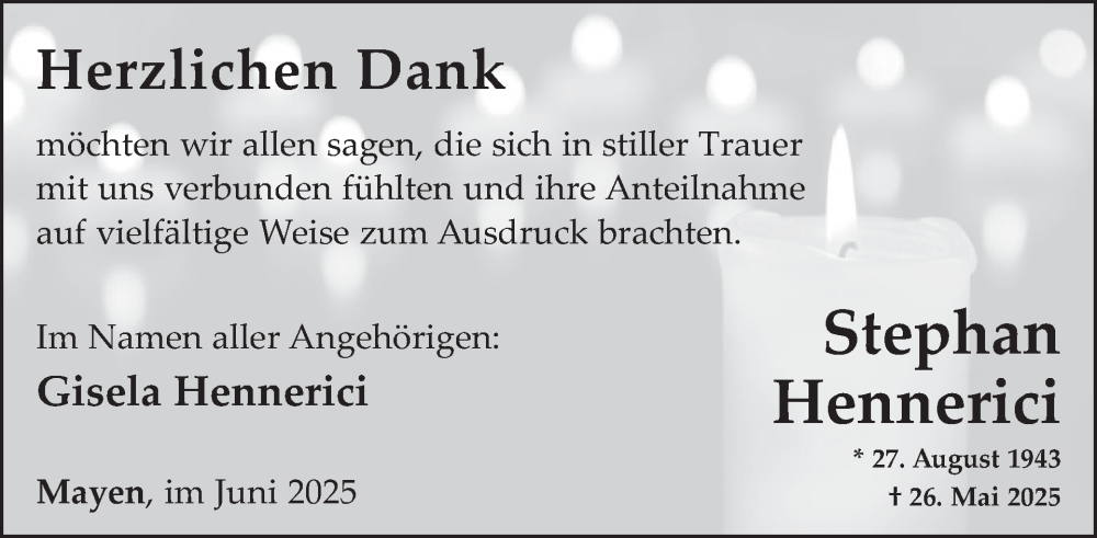 Hier finden Sie alle Traueranzeigen aus der Zeitung, die bisher für Stephan Hennerici erschienen sind. Weitere Traueranzeigen, die in der Zeitung erscheinen, werden hier ebenfalls aufgelistet