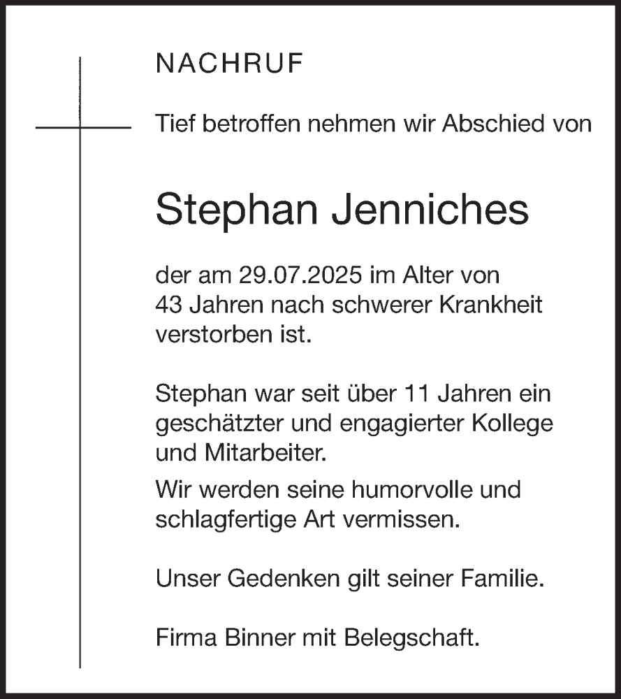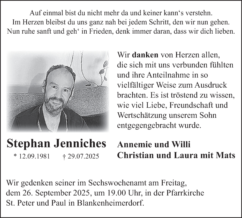 Hier finden Sie alle Traueranzeigen aus der Zeitung, die bisher für Stephan Jenniches erschienen sind. Weitere Traueranzeigen, die in der Zeitung erscheinen, werden hier ebenfalls aufgelistet
