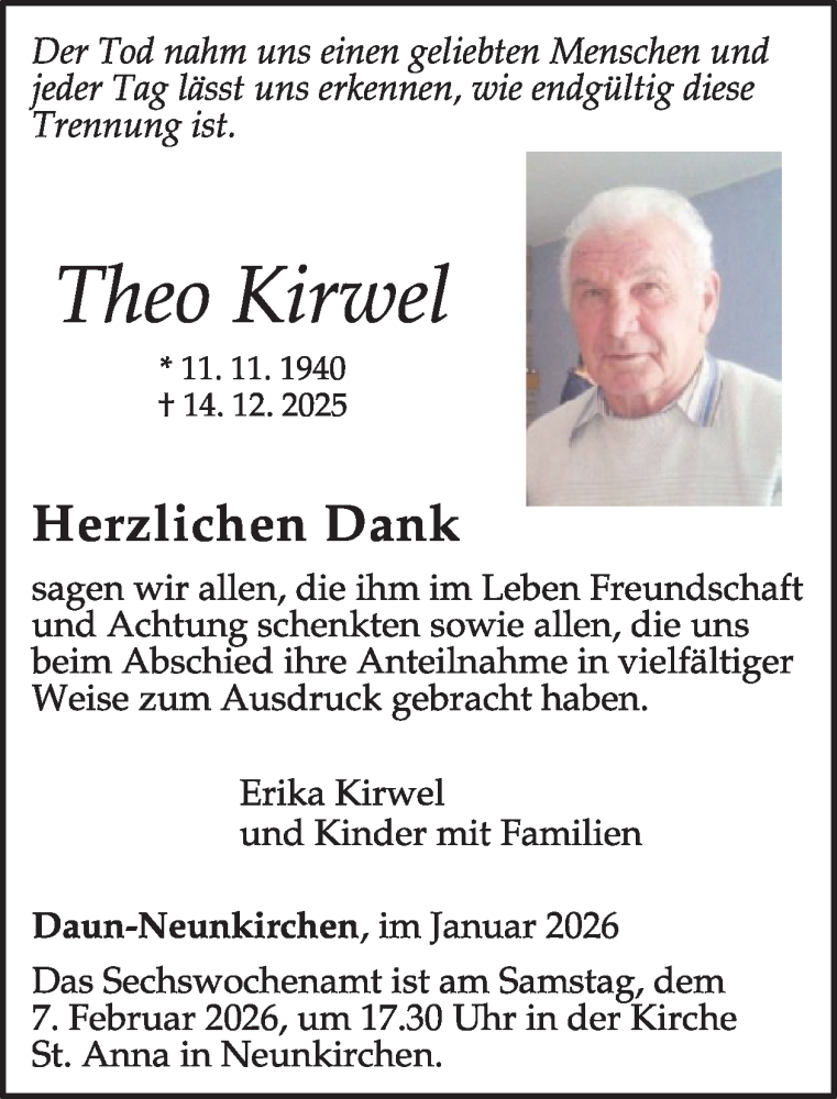 Hier finden Sie alle Traueranzeigen aus der Zeitung, die bisher für Theo Kirwel erschienen sind. Weitere Traueranzeigen, die in der Zeitung erscheinen, werden hier ebenfalls aufgelistet