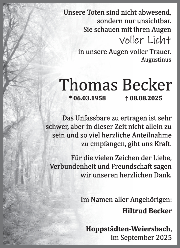 Hier finden Sie alle Traueranzeigen aus der Zeitung, die bisher für Thomas Becker erschienen sind. Weitere Traueranzeigen, die in der Zeitung erscheinen, werden hier ebenfalls aufgelistet