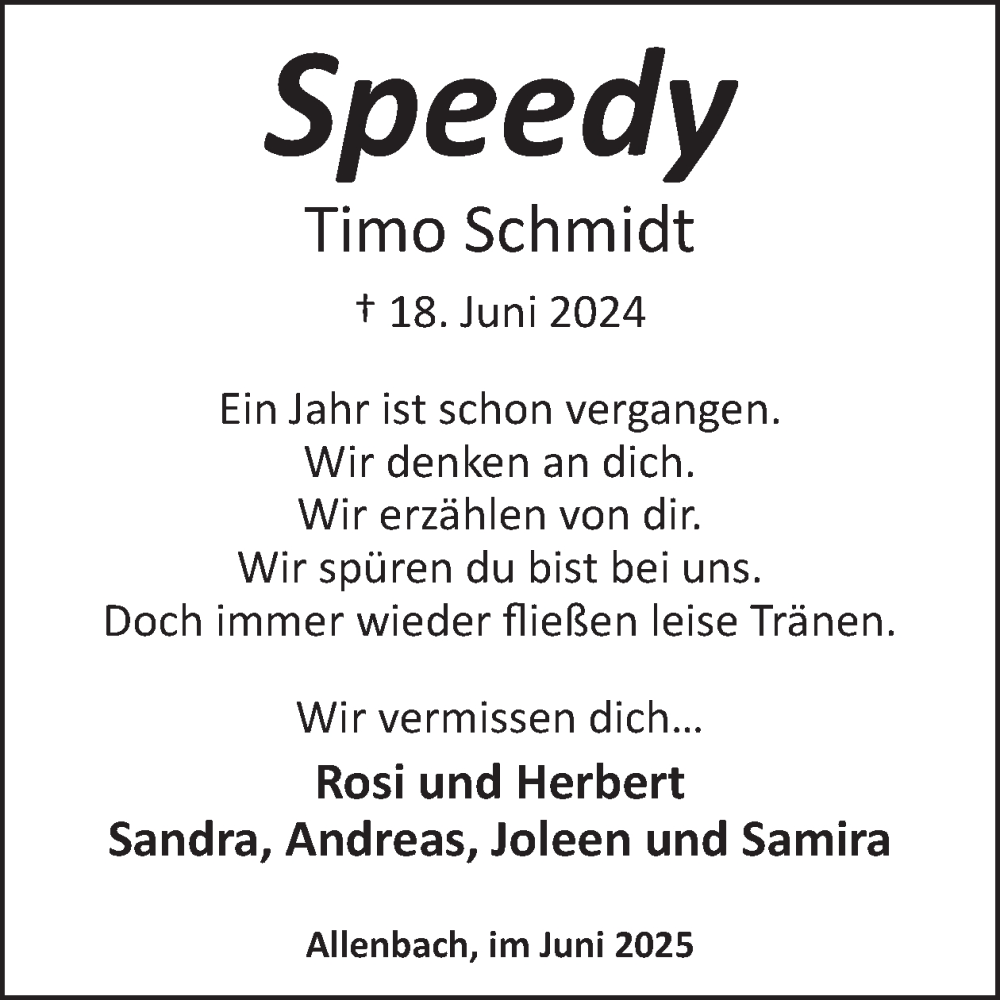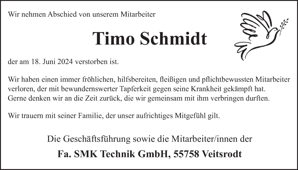 Hier finden Sie alle Traueranzeigen aus der Zeitung, die bisher für Timo Schmidt erschienen sind. Weitere Traueranzeigen, die in der Zeitung erscheinen, werden hier ebenfalls aufgelistet