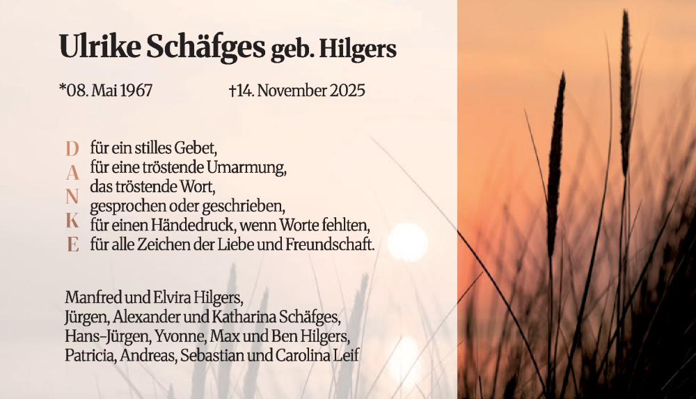 Hier finden Sie alle Traueranzeigen aus der Zeitung, die bisher für Ulrike Schäfges erschienen sind. Weitere Traueranzeigen, die in der Zeitung erscheinen, werden hier ebenfalls aufgelistet