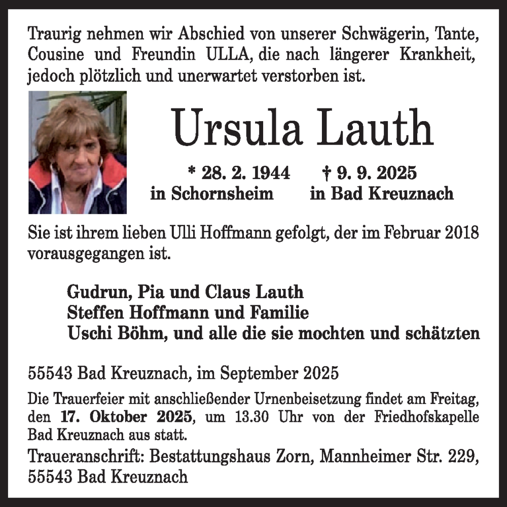 Hier finden Sie alle Traueranzeigen aus der Zeitung, die bisher für Ursula Lauth erschienen sind. Weitere Traueranzeigen, die in der Zeitung erscheinen, werden hier ebenfalls aufgelistet
