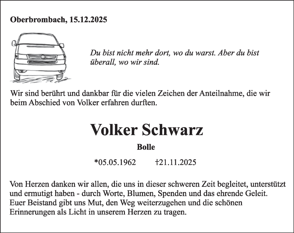 Hier finden Sie alle Traueranzeigen aus der Zeitung, die bisher für Volker Schwarz erschienen sind. Weitere Traueranzeigen, die in der Zeitung erscheinen, werden hier ebenfalls aufgelistet