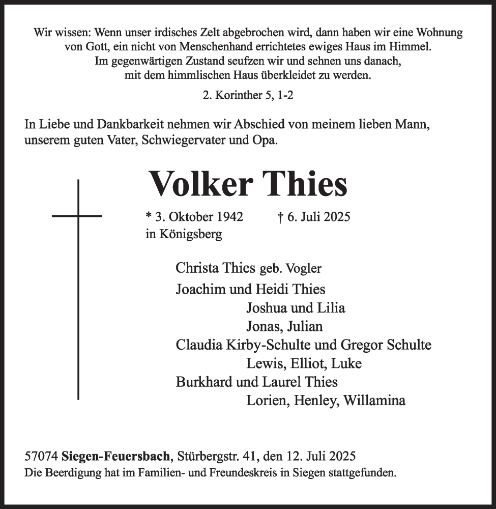 Hier finden Sie alle Traueranzeigen aus der Zeitung, die bisher für Volker Thies erschienen sind. Weitere Traueranzeigen, die in der Zeitung erscheinen, werden hier ebenfalls aufgelistet
