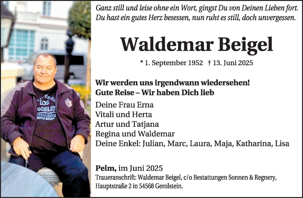 Hier finden Sie alle Traueranzeigen aus der Zeitung, die bisher für Waldemar Beigel erschienen sind. Weitere Traueranzeigen, die in der Zeitung erscheinen, werden hier ebenfalls aufgelistet