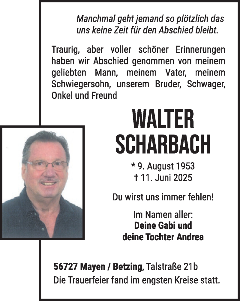 Hier finden Sie alle Traueranzeigen aus der Zeitung, die bisher für Walter Scharbach erschienen sind. Weitere Traueranzeigen, die in der Zeitung erscheinen, werden hier ebenfalls aufgelistet