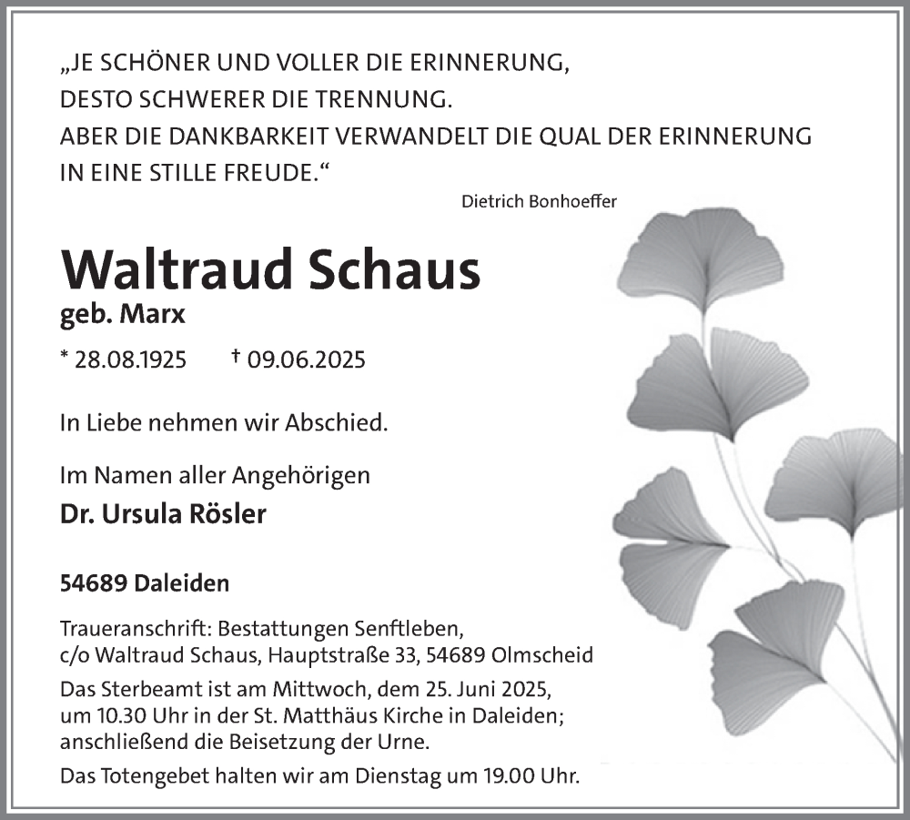 Hier finden Sie alle Traueranzeigen aus der Zeitung, die bisher für Waltraud Schaus erschienen sind. Weitere Traueranzeigen, die in der Zeitung erscheinen, werden hier ebenfalls aufgelistet