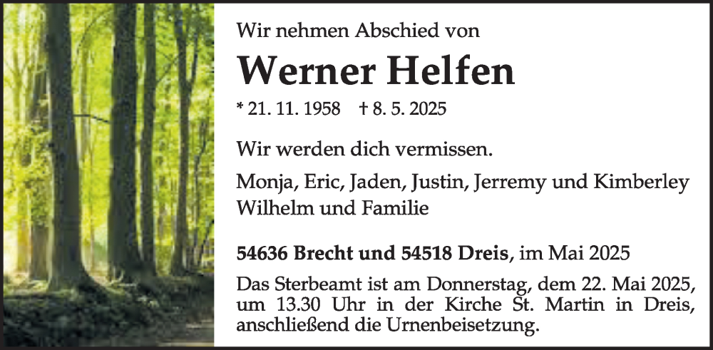 Hier finden Sie alle Traueranzeigen aus der Zeitung, die bisher für Werner Helfen erschienen sind. Weitere Traueranzeigen, die in der Zeitung erscheinen, werden hier ebenfalls aufgelistet
