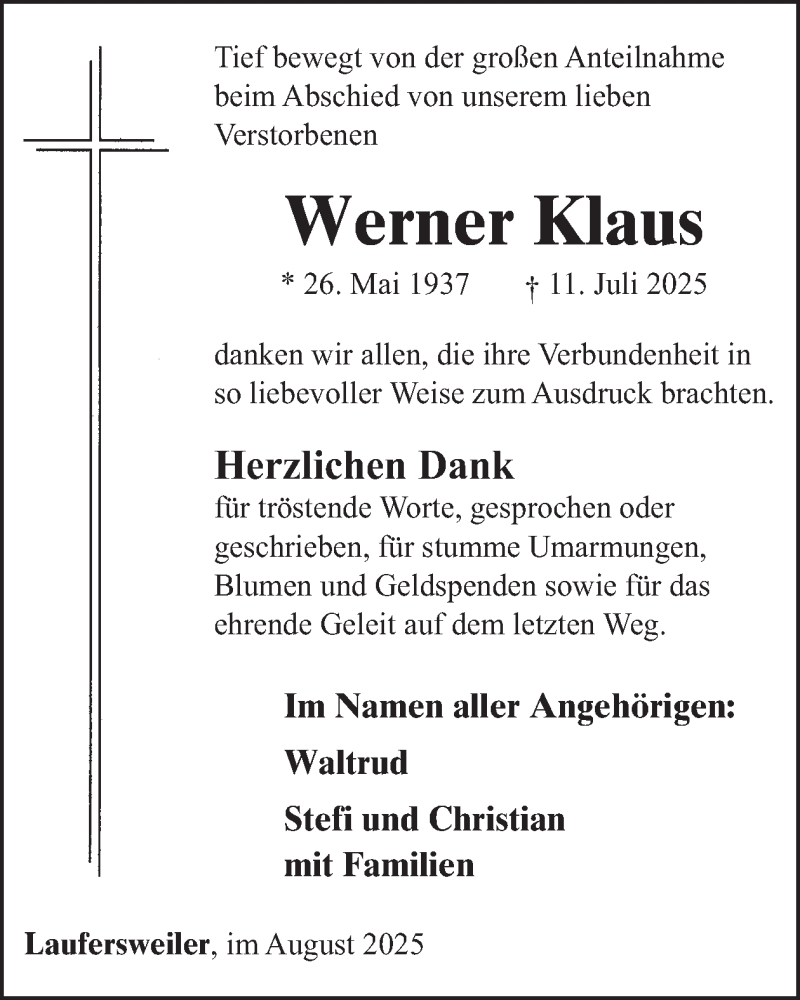 Hier finden Sie alle Traueranzeigen aus der Zeitung, die bisher für Werner Klaus erschienen sind. Weitere Traueranzeigen, die in der Zeitung erscheinen, werden hier ebenfalls aufgelistet