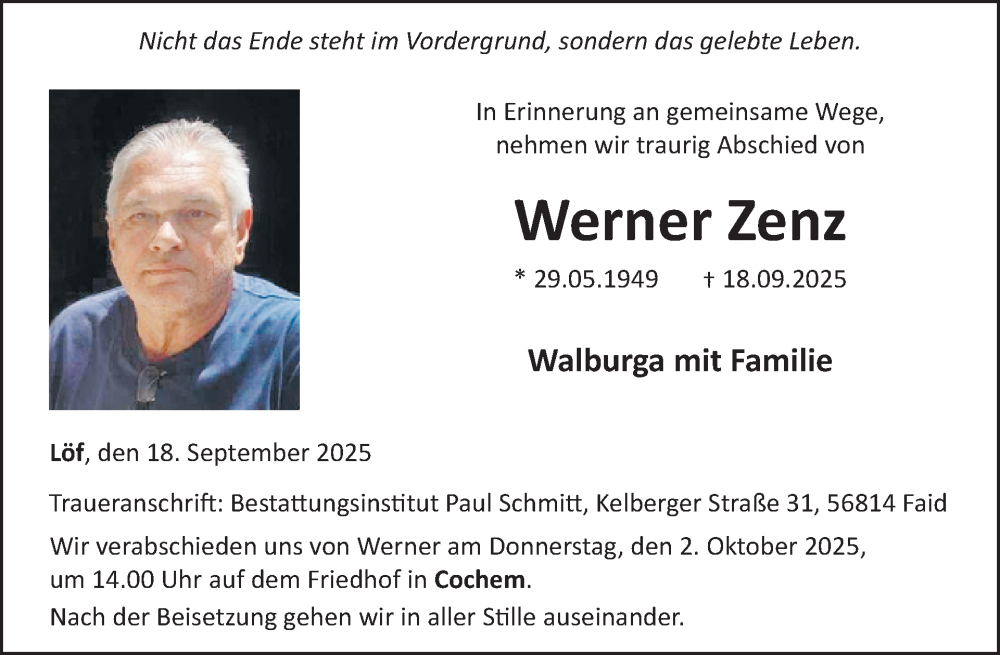 Hier finden Sie alle Traueranzeigen aus der Zeitung, die bisher für Werner Zenz erschienen sind. Weitere Traueranzeigen, die in der Zeitung erscheinen, werden hier ebenfalls aufgelistet