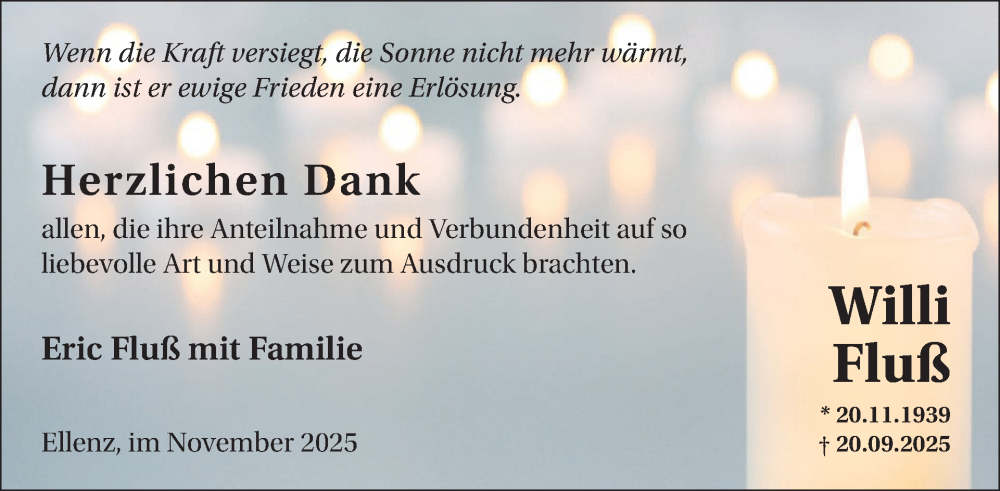 Hier finden Sie alle Traueranzeigen aus der Zeitung, die bisher für Willi Fluß erschienen sind. Weitere Traueranzeigen, die in der Zeitung erscheinen, werden hier ebenfalls aufgelistet