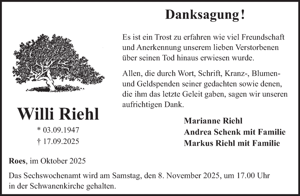 Hier finden Sie alle Traueranzeigen aus der Zeitung, die bisher für Willi Riehl erschienen sind. Weitere Traueranzeigen, die in der Zeitung erscheinen, werden hier ebenfalls aufgelistet