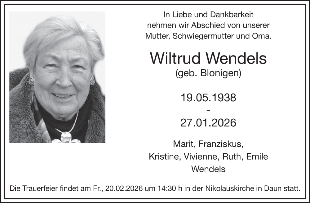 Hier finden Sie alle Traueranzeigen aus der Zeitung, die bisher für Wiltrud Wendels erschienen sind. Weitere Traueranzeigen, die in der Zeitung erscheinen, werden hier ebenfalls aufgelistet