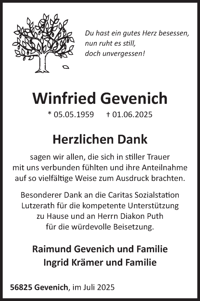 Hier finden Sie alle Traueranzeigen aus der Zeitung, die bisher für Winfried Gevenich erschienen sind. Weitere Traueranzeigen, die in der Zeitung erscheinen, werden hier ebenfalls aufgelistet