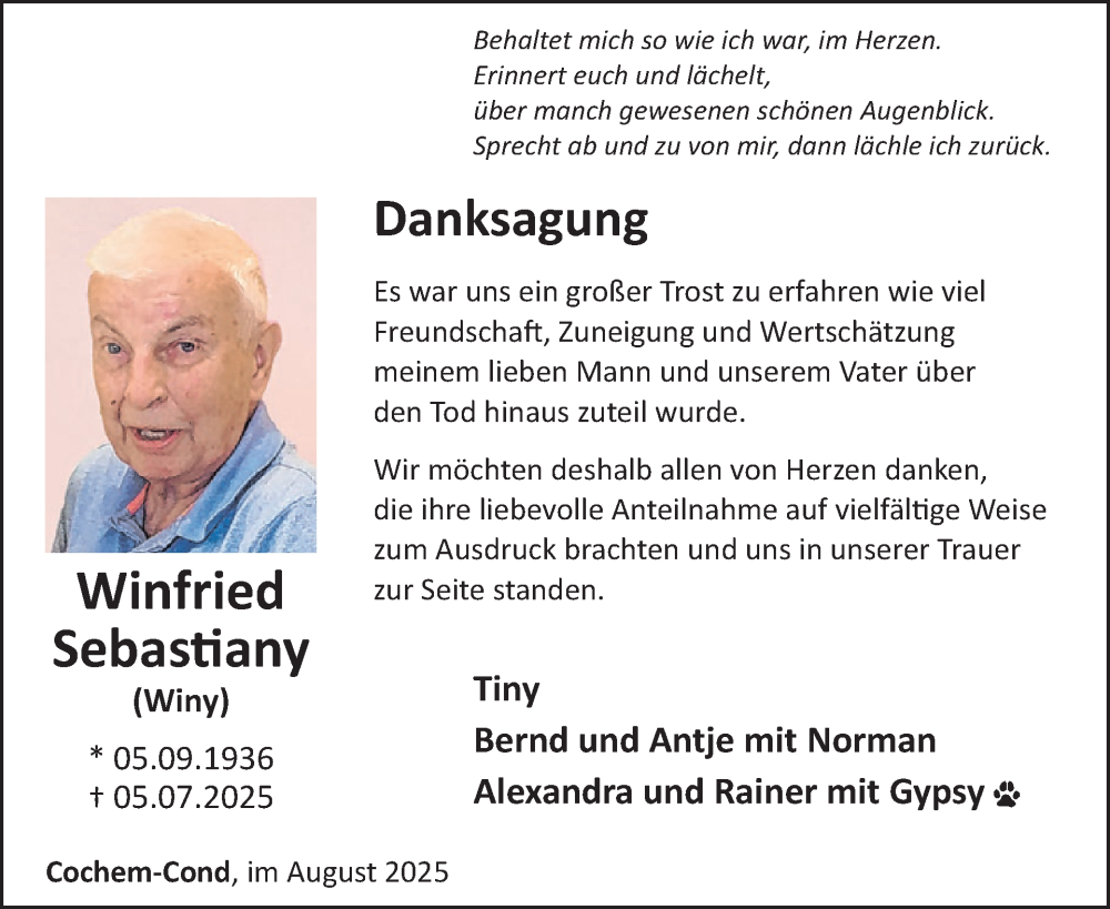Hier finden Sie alle Traueranzeigen aus der Zeitung, die bisher für Winfried Sebastiany erschienen sind. Weitere Traueranzeigen, die in der Zeitung erscheinen, werden hier ebenfalls aufgelistet