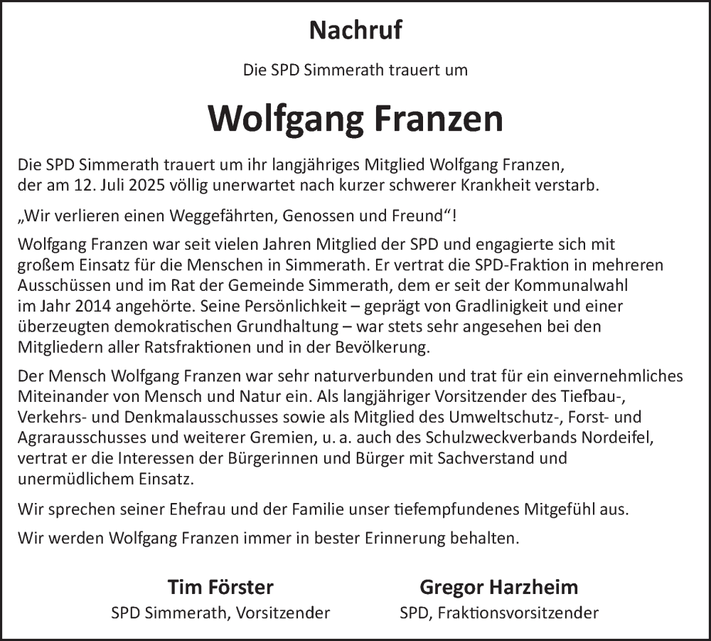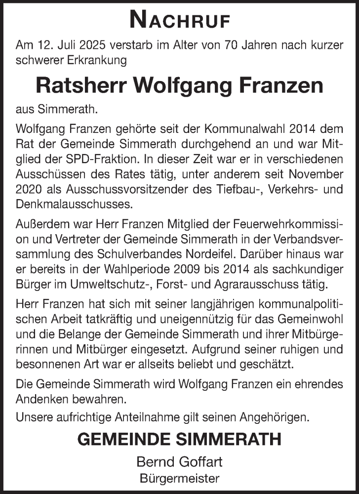Hier finden Sie alle Traueranzeigen aus der Zeitung, die bisher für Wolfgang Franzen erschienen sind. Weitere Traueranzeigen, die in der Zeitung erscheinen, werden hier ebenfalls aufgelistet