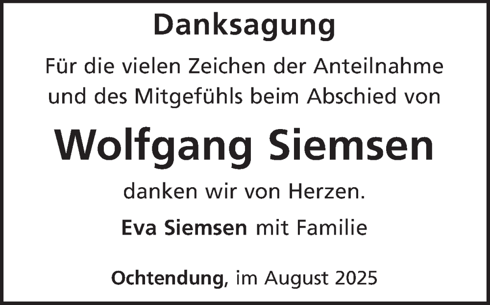 Hier finden Sie alle Traueranzeigen aus der Zeitung, die bisher für Wolfgang Siemsen erschienen sind. Weitere Traueranzeigen, die in der Zeitung erscheinen, werden hier ebenfalls aufgelistet