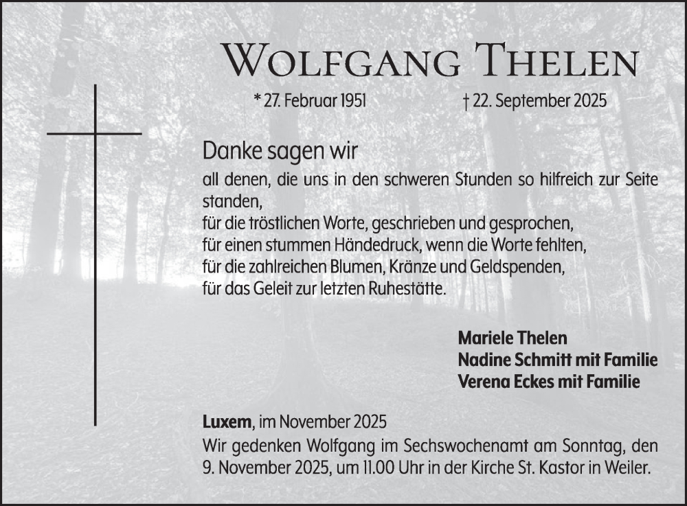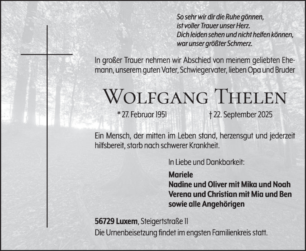 Hier finden Sie alle Traueranzeigen aus der Zeitung, die bisher für Wolfgang Thelen erschienen sind. Weitere Traueranzeigen, die in der Zeitung erscheinen, werden hier ebenfalls aufgelistet